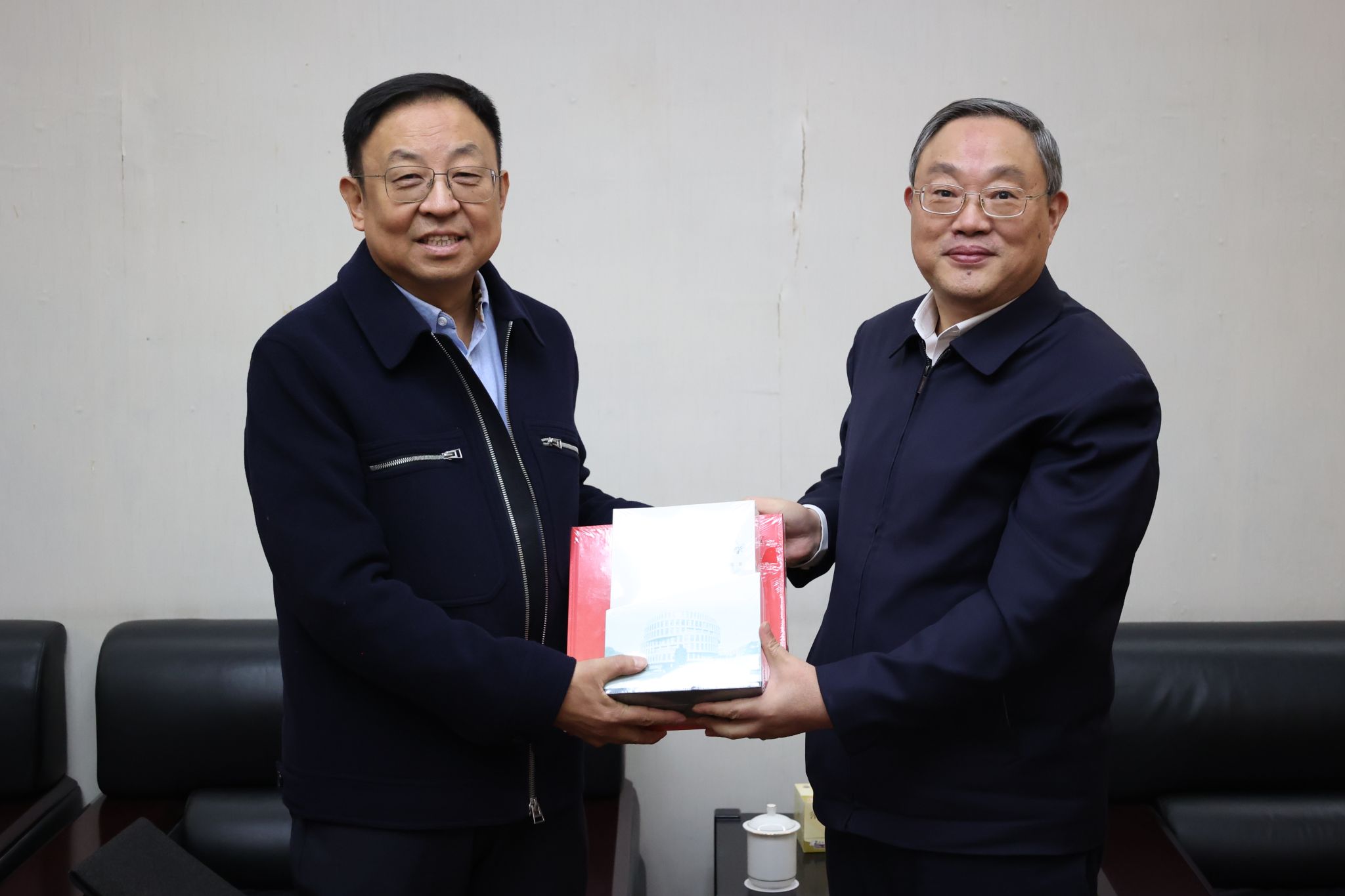 会前国产亚洲精品美女久久久领导班子成员与楼巍会长亲切交谈,并向楼会长赠送《百年上大画传》等书。