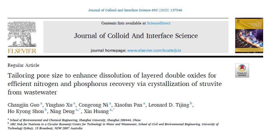 成果二:孔径调控增强层状双金属氧化物溶解促进鸟粪石结晶高效回收废水中氮和磷(Tailoring Pore Size to Enhance Dissolution of Layered Double Oxides for Efficient Nitrogen and Phosphorus Recovery via Crystallization of Struvite from Wastewater,发表于《J. Colloid Interf. Sci.》)