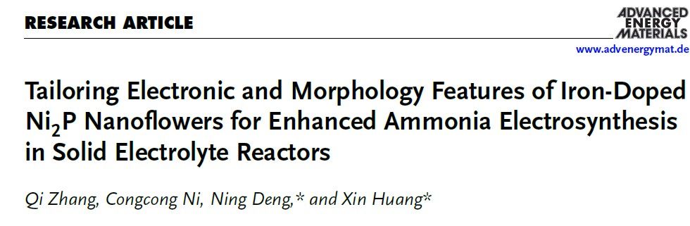 成果一:定制设计Fe掺杂Ni2P纳米花电子/形态特征以增强固态电解质反应器电合成氨(Tailoring Electronic and Morphology Features of Iron-Doped Ni2P Nanoflowers for Enhanced Ammonia Electrosynthesis in Solid Electrolyte Reactors,发表于《Adv. Energy Mater.》)